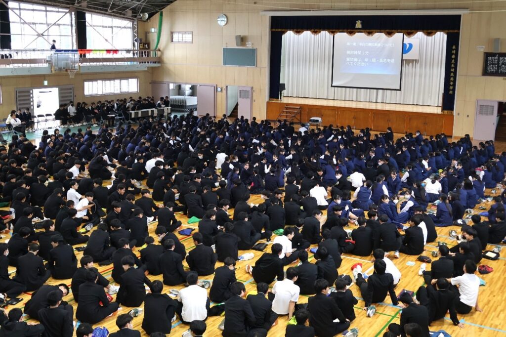 11月4日(火)7校時に、第2回生徒総会が行われました。今年は、生徒が作成した資料をスクリーンに映し出しながら進行しました。まず初めに、各種委員会の後期委員長より、後期の活動目標・計画の発表がありました。次に学校への要望案について、審議が行われました。3年生が積極的に意見を出したり、質問したりするなど、生徒たちが自ら学校生活をより良いものにしようと、全校生徒が協力しながら、主体的に考えている様子が感じられました。投票はFormsを用いて行い、ICTを活用して効率化を図りました。今後、ますます生徒が主体となって、生徒会行事や委員会活動に取り組んでいくことが期待できるような充実した時間となりました。
